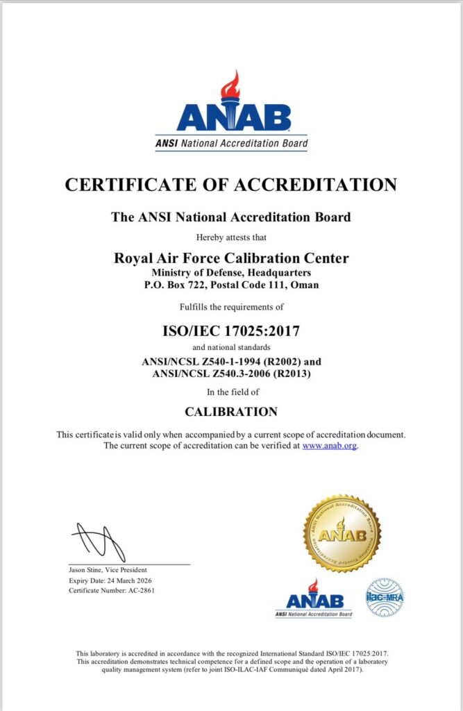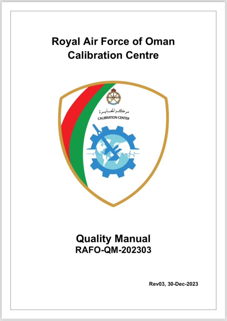 RAFO Calibration center Quality Manual serves as the core reference document outlining the Royal Air Force of Oman’s Calibration Centre’s full commitment to internationally recognized quality standards. Aligned with ISO/IEC 17025:2017, ANSI Z540-1, and ANSI Z540.3, the manual details the Centre’s policies, procedures, and systems designed to ensure precision, impartiality, data confidentiality, and technical excellence across all calibration activities.
